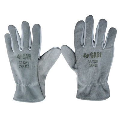 Luva de segurança confeccionada com vaqueta curtida ao cromo, com formato de cinco dedos (forma L) com reforço na palma, reforço de costura entre polegar e indicador e entre dedos anelares.
